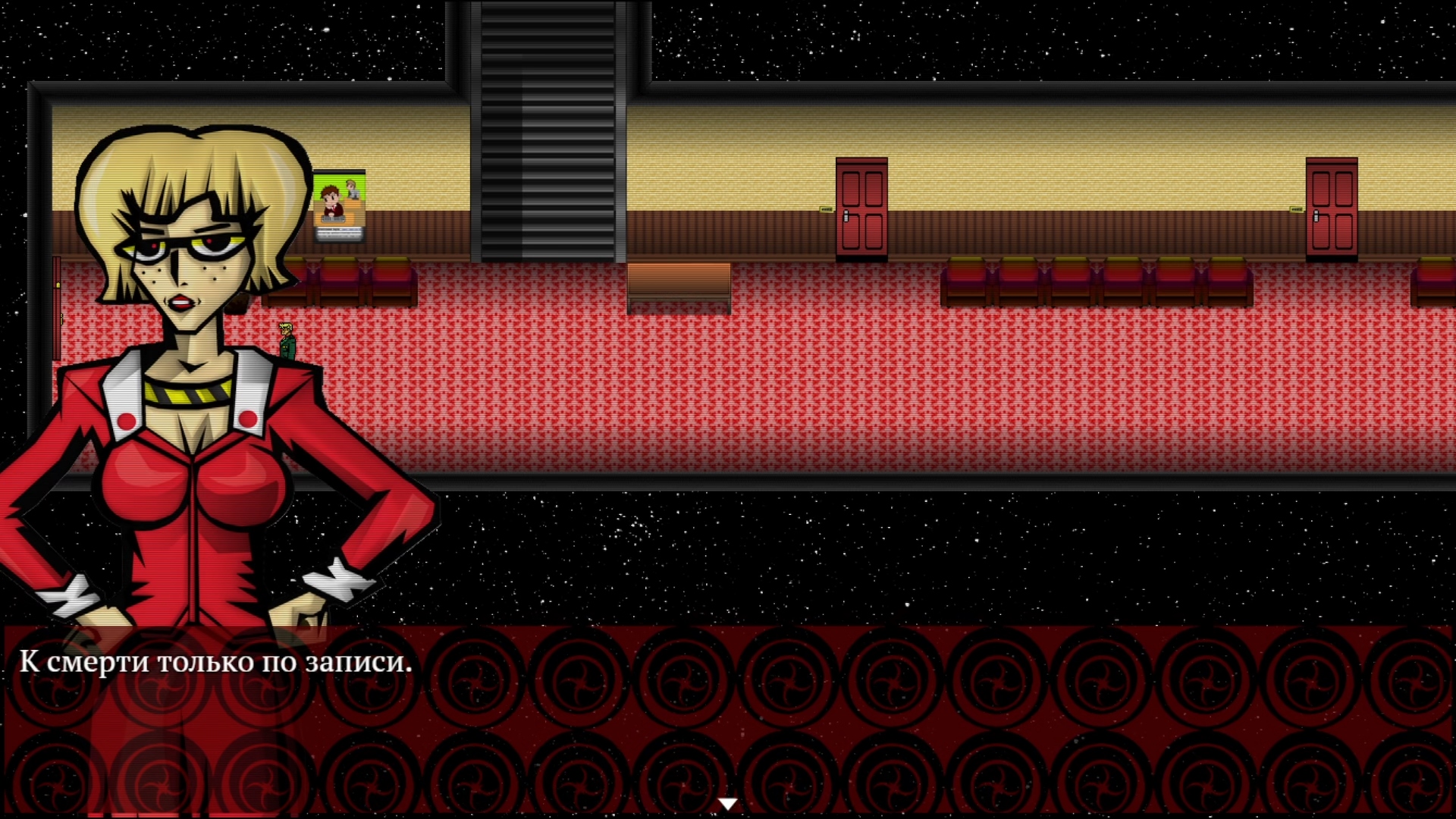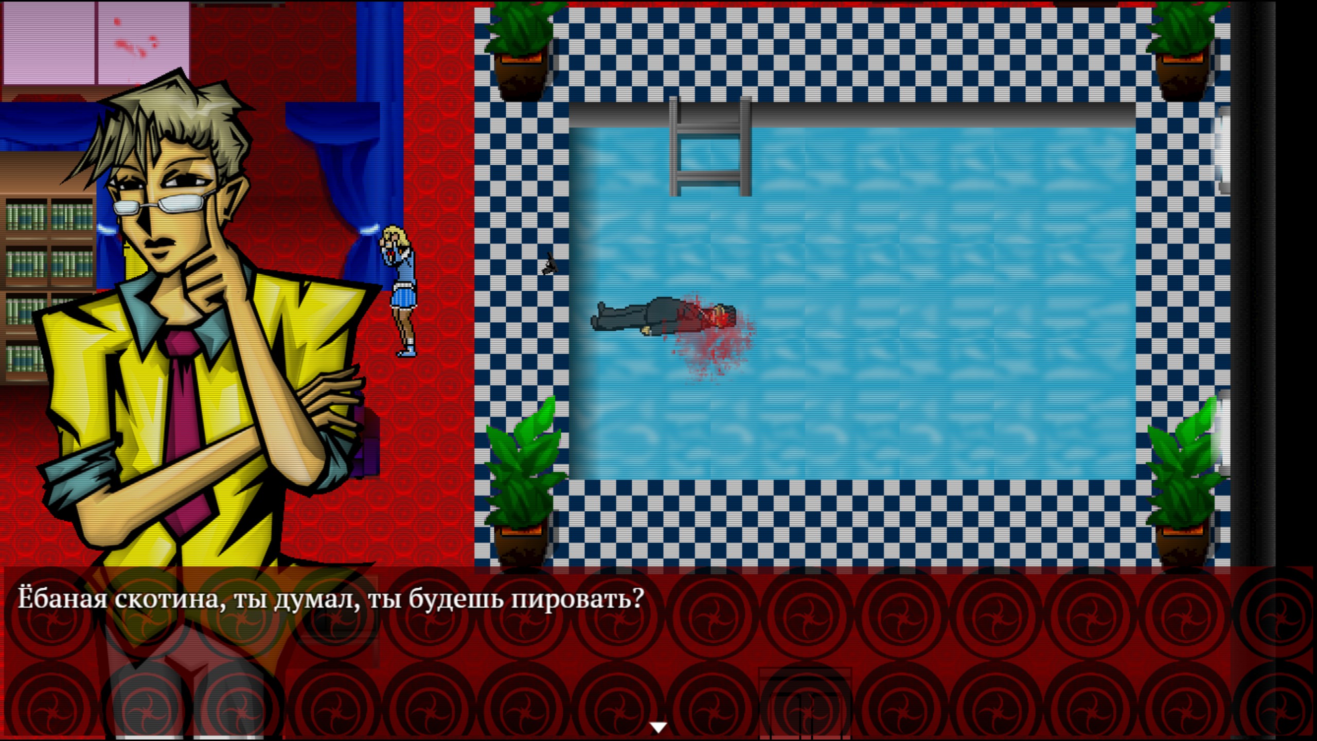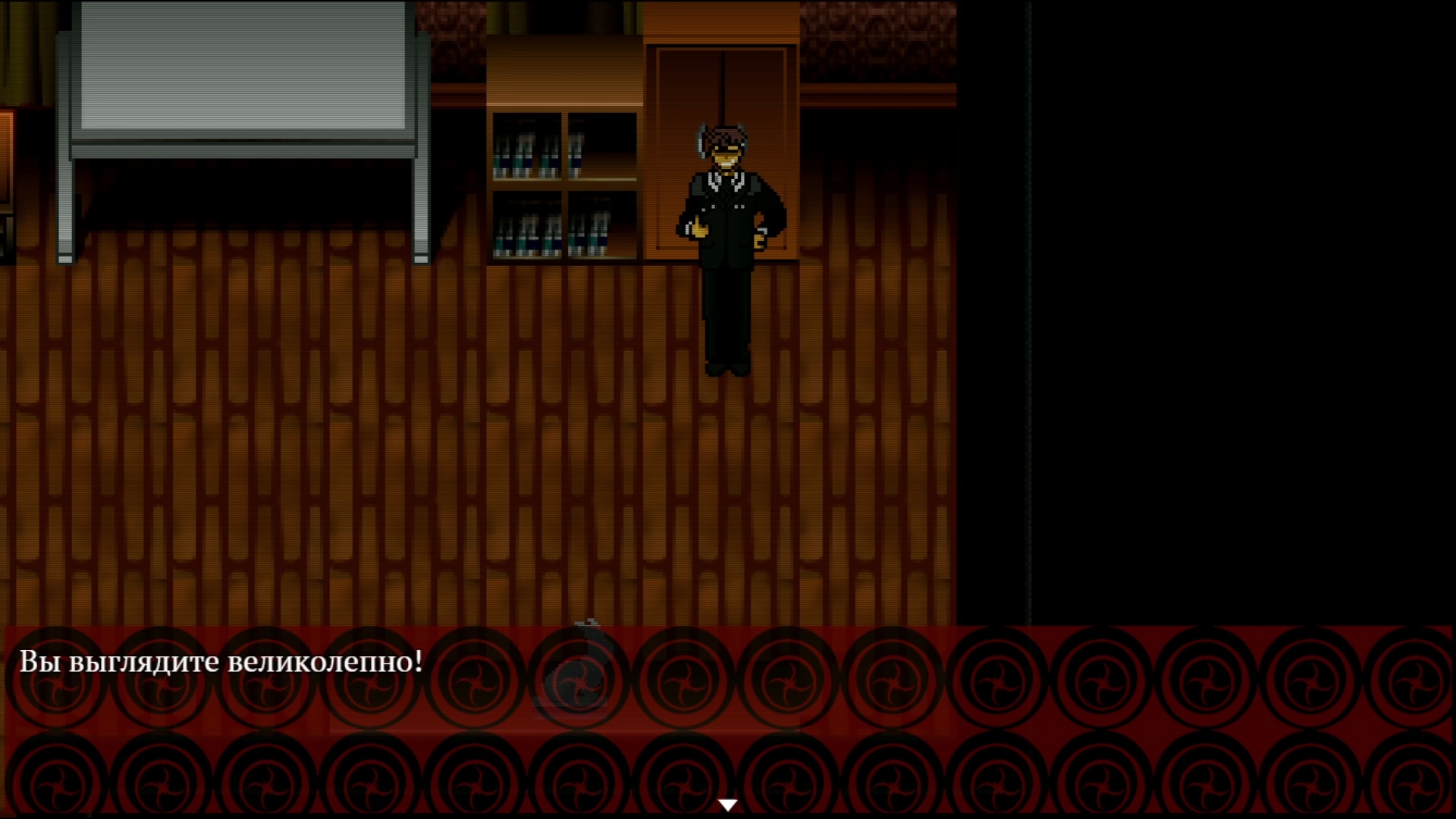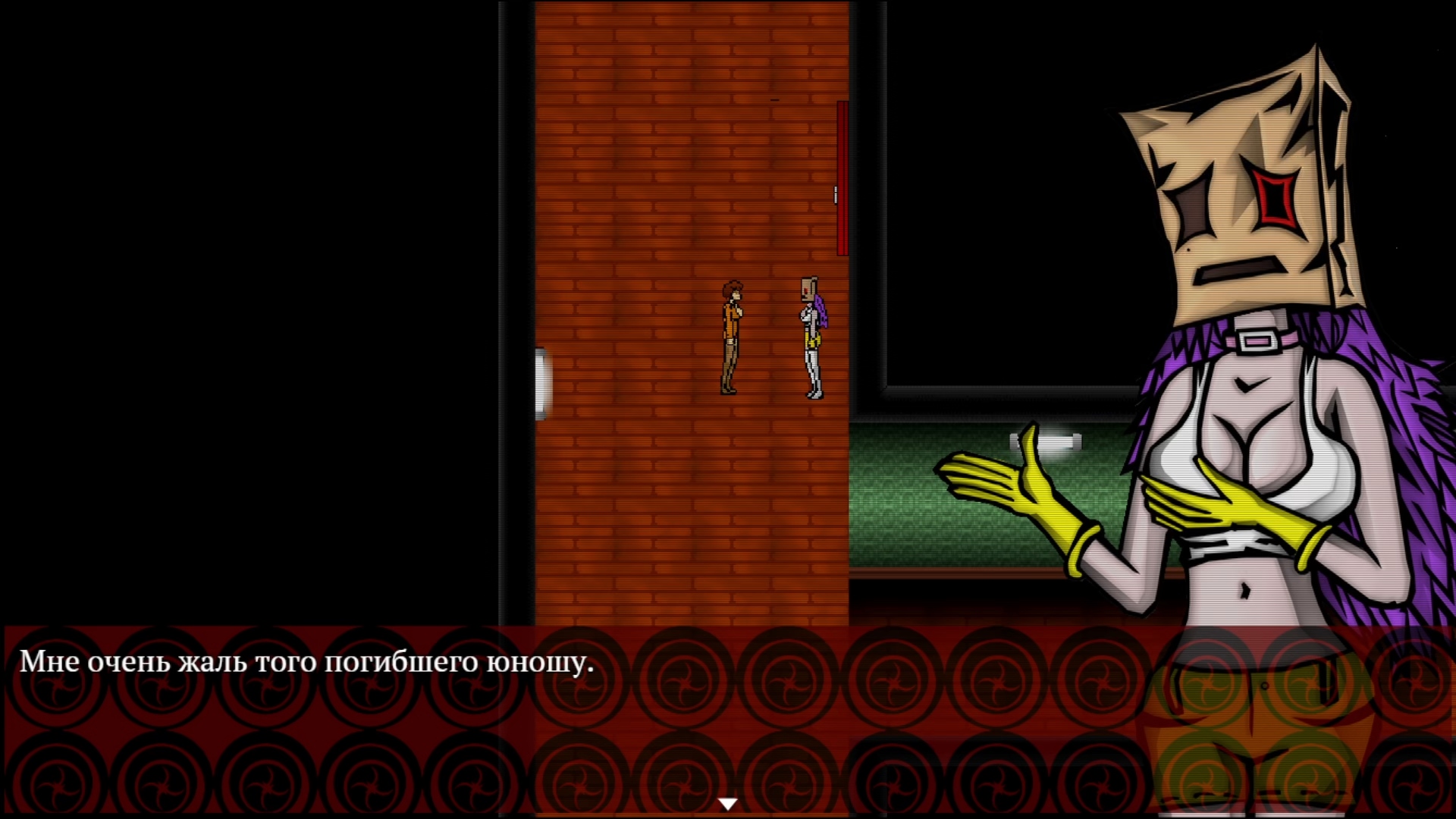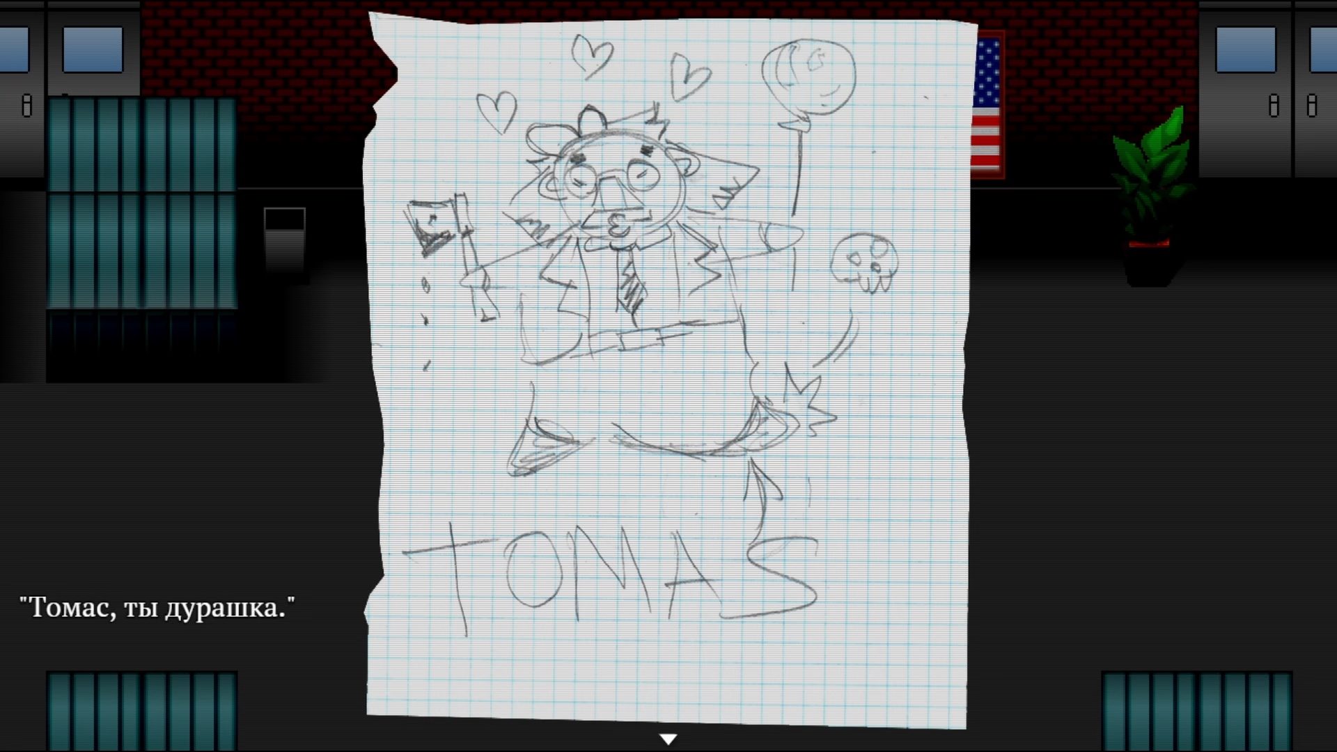 И пресвятые угодники! — как же много точек взаимодействия сюда напихал автор! И я имею в виду много. Действительно МНОГО. Каждый стол, каждый цветочек, каждый шкафчик, каждая более-менее выделяющаяся вывеска. И разные марионетки ещё по разному реагируют на одни и те же вещи. Кому-то изображение на столе покажется непонятной мазнёй, а кто-то узнает в нём знакомого персонажа. У кого-то труп на дороге вызовет отвращение, а кто-то поржёт по поводу того, как его забавно скрючило. А кто-то из-за собственных бед с башкой видит мир иначе, что, суммируясь с нестабильной реальностью внутри небоскрёба, порождает новые события. Знаете, что такое настоящее безумие? Это кликать каждый подозрительный элемент декора в надежде на оригинальную реплику, а потом возвращаться в безопасную комнату, менять марионетку и снова заниматься пиксель-хантингом в ожидании, когда произойдёт что-то внештатное. И происходит ж ведь!
