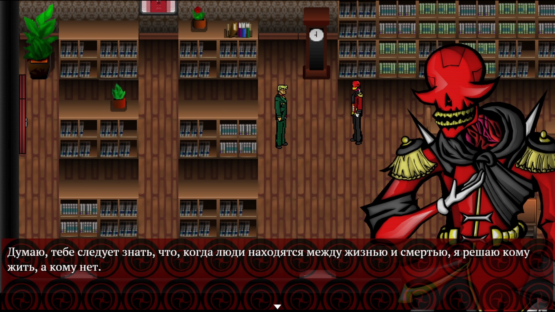 И когда расследование приобретает огнестрельные черты, а игра переходит в боевой режим, у меня возникает два вопроса: «это точно RPG Maker?» и «как движок вообще не развалился от такого количества надстроек?» Стычки с порождениями оккультных практик Кровавого Возрождения по всем пошаговым традициям переносят на отдельный экран, — однако дальнейшие действия менее очевидны. Хвала сарделькам, что тут есть обучение. Кстати, знакомьтесь. Нашего гида зовут Буни, и у неё по каким-то причинам голова живёт отдельно от тела. Удивительно? Ничего, скоро удивляться не останется сил. Краткий ликбез по игровым механикам, впрочем, не помешал мне окочуриться в первом же бою и отлететь на начальный экран… ДЖВАЖДЫ. Второй раз я отлетел, когда начал проверять разные клавиши и узнал, что F5 моментально бросает в главное меню. Карыч балбес. В общем, прохождение пролога сильно затянулось.