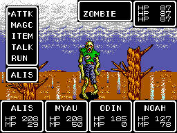 Последнее наиболее важно, потому как безнаказанно перемещаться по карте мира Phantasy Star всё равно не позволит, так что будьте готовы к непрекращающемуся потоку случайных сражений! Поскольку игрушка появилась задолго до изобретения слова «баланс», интенсивность материализующихся из воздуха монстров лишена какой-либо логики и полностью непредсказуема. Ваша новоявленная команда спасителей мира порой может спокойно истоптать всю поверхность планеты, а может подвергаться нападениям каждый шаг. Сама же боевая система очень проста и бесхитростна, из-за чего подавляющее большинство сражений ограничено только двумя пунктами меню: «дать по морде» и «убежать». Можно, конечно, попытаться ещё и магией кого-нибудь удивить, особенно ближе ко второй половине игры, когда все чародеи в коллективе освоят свои наиболее эффективные заклинания, но очень быстро придёт осознание того факта, что тратить ценную ману на рядовых противников не только бессмысленно, но и очень опасно: мало того, что всяких эфиров и прочих восстановителей маны игрой не предусмотрено, из-за чего приходится возвращаться на заправку в ближайший город, так ещё и очков маны даже у профильных магов не сказать чтобы много, и тратить их на что-то кроме лечения и разминирования сундуков с сокровищами просто непрактично. Другая причина неэффективности магии в бою — практически полное отсутствие атакующих заклинаний в игре. Фактически, их всего три: файерболлы (очень слабые, но дешёвые), ветер (средний урон) и молнии (огромный урон по всем врагам за соответствующую цену). Прочее многообразие чар вертится преимущественно вокруг усиления героев и ослабления противников и используется не особо часто. Четвёртый вариант развития событий, использующийся на практике ещё реже, чем магия, но определённо добавляющий игре несколько очков уникальности, — попытаться поговорить с противником. Учитывая, что межпланетные перелёты в мире Phantasy Star являются обыденным явлением, можно нарваться не только на кровожадного монстра, но и на местных абориген, воевать с которыми необязательно. Если же с ними поговорить, то они, подсказав что-нибудь по дальнейшему прохождению (или просто налив воды), уйдут восвояси, на чём сражение закончится. К сожалению, разговорчивыми являются только коренные жители планеты Мотавия, со всеми остальными разумными врагами придётся общаться с помощью магии «Телепатия», что и делает пункт «Говорить» таким бесполезным.