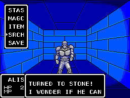 Подземелья… Главный ночной кошмар всякого, кто рискнул бросить вызов этой игре. Если раньше Phantasy Star просто давала пощёчину с нелинейным прохождением, острой нехваткой денег и заминированными сундуками, то теперь она валит игроков на пол и начинает пинать их ногами. Сами посудите: лабиринты от первого лица, тонны случайных сражений, отсутствие карты и необходимость ориентироваться в пространстве по компасу, который надо ещё постоянно вытаскивать из неудобного инвентаря, невидимые двери и ловушки, сбрасывающие на этаж ниже. Всё это приводит к одному очевидному выводу: нафиг эту иг… Нет, не к этому! Кхем. Даже не пытайтесь лезть в подземелья без телепорта, заблаговременно купленного в одном из магазинов. Очень велика вероятность потеряться в них настолько сильно, что единственным способом снова увидеть свет Божий станет загрузка со старого сохранения. Несмотря на то, что в подземельях начисто отсутствуют открытые локации, из-за чего все блуждания сводятся к одному очень длинному и замороченному кишечнику, потеряться в них проще простого, а уж если путь начинает ветвиться…
